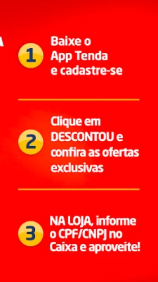 Veja como é fácil aproveitar as vantagens e economizar: - Baixe o App Tenda e cadastre-se; - Clique em “DESCONTOU” e confira as ofertas da sua loja; - NA LOJA, informe o CPF/CNPJ no caixa.