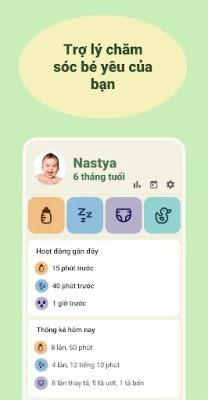 - Theo dõi bú mẹ và cho bé ăn - Theo dõi ăn cho trẻ sơ sinh - Theo dõi giấc ngủ của bé - Theo dõi thay tã cho bé - Theo dõi chăm sóc bé - Chăm sóc trẻ sơ sinh - Lịch và ghi chú