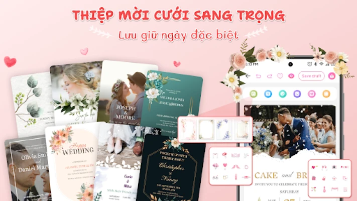 ✨Thiệp mời đám cưới đầy phong cách💍: Với ứng dụng Thiệp Chúc Mừng & Sinh Nhật, bạn có thể tạo Lời mời đám cưới độc đáo và khó quên cho ngày trọng đại của mình, đồng thời lan tỏa niềm vui và kỷ niệm đến mọi người trong các bữa tiệc.