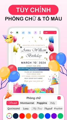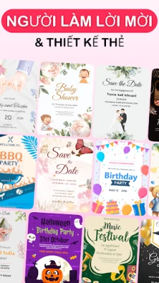 Từ sinh nhật đến sự kiện kinh doanh, ứng dụng Công cụ tạo thiệp mời và Thiết kế thiệp cho phép bạn tạo lời mời kỹ thuật số được cá nhân hóa. Lưu thiết kế của bạn và chia sẻ chúng ngay lập tức qua ứng dụng nhắn tin, email hoặc phương tiện truyền thông xã hội.