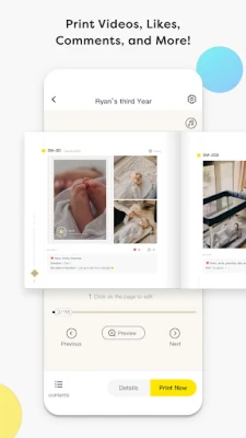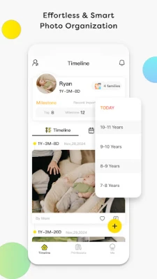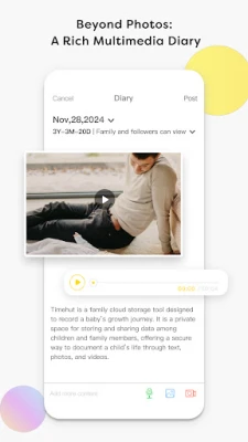 You can add photos & videos, write a future letter or a record audio diary to your baby’s timeline. Multimedia is supported. Also, each timeline is automatically chronological based on baby’s age.
