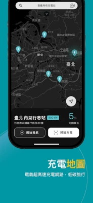 以地圖界面呈現《U-POWER》旗下各超高速充電站位置及可用槍位數量。輕點站點圖示可以讀取站點及周邊介紹,並可啟動導航前往充電站。