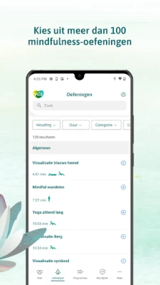 Kies een stem (man of vrouw) en volg de oefening waar en wanneer je maar wilt. Er is altijd een oefening die past in jouw dag. Van enkele minuten tot ruim een half uur. Filter op bijvoorbeeld dagdeel. Zo is de bodyscan heel populair bij het slapen.