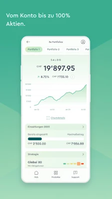 • Höchste Flexibilität: Gestalte deine Anlagestrategie individuell – von verzinsten Konten bis zu 99% Aktien, breit diversifiziert mit passiven, indexbasierten Bausteinen. Passe deine Strategie jederzeit an – ohne zusätzliche Kosten.