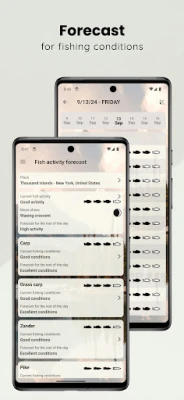 - Forecast for fishing conditions: Our app provides a tailored forecast for each species, ensuring you know best times for fishing of Carp, Grass Carp, Zander, Pike, Catfish, Bass, Perch, Bream, Crappie, Barbel, Tench, Trout, Crucian Carp, Grayling, Nase, Eel, Asp, Muskie, Walleye, Roach and Tilapia.
