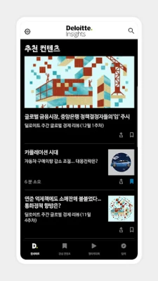 딜로이트 인사이트 앱은 글로벌 No.1 회계∙컨설팅 전문가 그룹 딜로이트 그룹의 전략적 Think Tank 역할을 수행하고 있는 인사이트의 지식 플랫폼으로 파트너사들의 혁신을 창조하는 데 일조하고자 합니다.