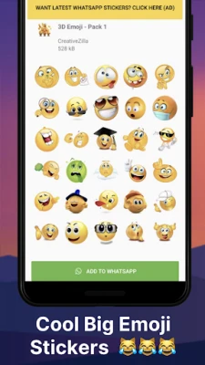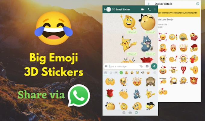 Try out the exciting 3D emoji Stickers with 3D Big Emoji Stickers for WhatsApp app. The app offers the best collection and the most fascinating 3D Emojis. Share funny 3D Emojis and funny memes with your loved ones and add life to your conversation.
