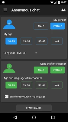 Main features: • choose themes (light, dark) • choose the gender, age and language of communication • text and image messages • notification about connecting and receiving message • saving a conversation • copy text in the chat • recognition of links