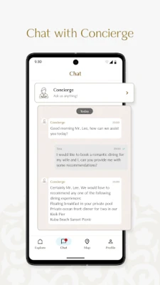 Chat with Concierge Chat with our concierge team, and let us cater to whatever your heart desires. Push notifications and multi-language are now supported.