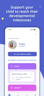 * Monitor your child's development with custom milestone tracking, providing insights appropriate to their age and developmental stage.