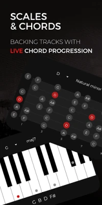 - Live Notes Mode: see the chord progression of the backing track along any scale on the guitar fretboard or piano view.