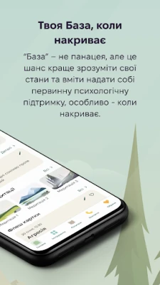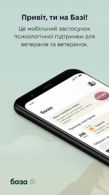 База - застосунок психологічної допомоги та підтримки ментального здоров’я ветеранів та військових. Це комплексний інструмент, який містить вправи для самодопомоги, засновані на техніках когнітивно-поведінкової терапії ( КПТ ) та інших доказових методів, включаючи: