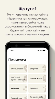 База створювалась у співпраці з ветеранами для того аби краще розуміти їх потреби, тому застосунок містить необхідні матеріали для підтримки та покращення психічного здоров'я військовослужбовців які перебувають (на активній службі) в армії, так і тих, хто повернувся на цивілку.