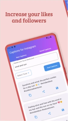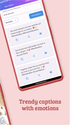 With our app, you’ll attract more likes and followers on Instagram effortlessly. Browse through our handpicked captions, use them, and watch as your engagement skyrockets. Become the go-to person among your friends for the coolest captions. Share your favorite captions directly from the app with friends and partners.