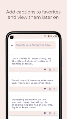 TheCaptionsApp includes the widest range of best quality captions, with a very neat and clean UI which makes all the captions easily accessible to you. You can also add captions to your favourites and view them later on.