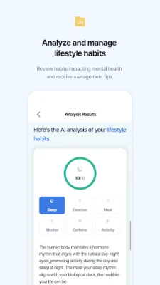 Evaluate lifestyle habits that heavily impact your mental health. You can check and analyze habits such as diet, exercise, sleep, and alcohol consumption, with guides provided for better management.