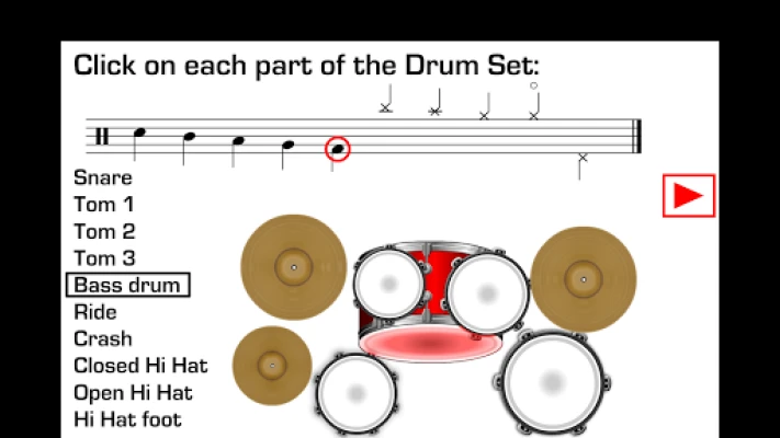 The DRUM SET NOTES Section on which you can click notes on the staff to see the corresponding part of the Drum Set and its name, or viceversa: you can click any part of the Drum Set to see the corresponding note on the staff.