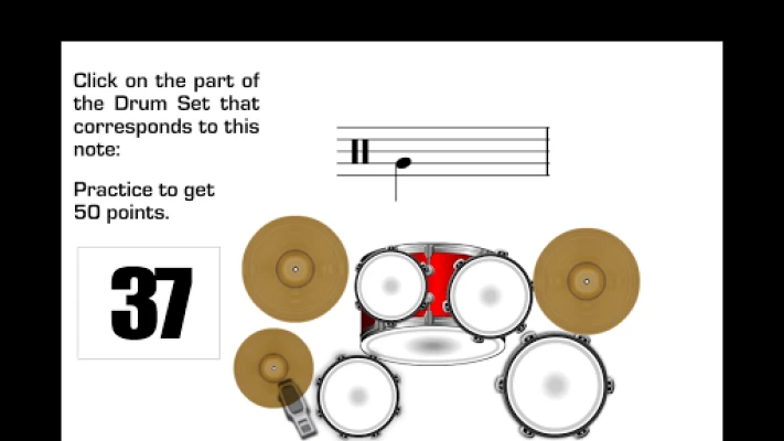 This section has exercises on which notes appear on the staff and you have to click the part of Drum Set corresponding to each particular note.