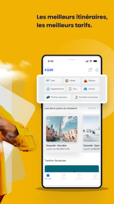 L'application EASE est l’outil indispensable pour votre voyage en Afrique et à l’étranger. Découvrez nos offres de séjours touristiques partout dans le monde. Réservez votre billet d'avion ainsi que votre hôtel et appartements meublés directement depuis votre téléphone. Besoin d'une voiture de location à votre arrivée à l'aéroport... EASE est à votre secours avec des véhicules disponibles à des prix imbattables.