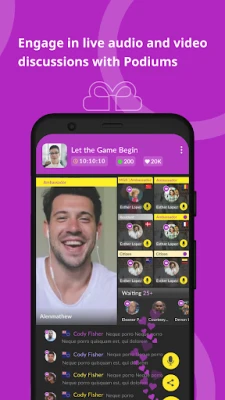 PODIUMS: Podiums are Live broadcasts for users to enjoy fun real time audio and video chat! Flashat Podiums come with various Podium Types like single screen, double screens, lecture of nine screens and Theater with eighteen screens.