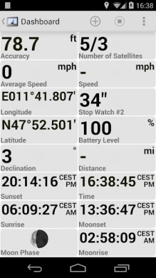Shows navigation values such as: Accuracy, Altitude, Speed, Battery, Bearing, Climb, Course, Date, Declination, Distance, ETA, Latitude, Longitude, Max Speed, Min Speed, Actual Speed, True Speed, Sunrise, Sunset, Moonset, Moonrise, Moon Phase, Target, Time, TTG, Turn.