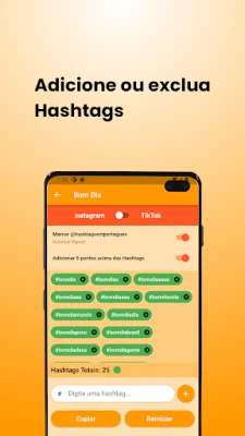 Você tem, ainda, a oportunidade de adicionar mais 5 hashtags personalizadas clicando no botão “+”, pois o Instagram tem um limite de 30 hashtags por foto. Caso precise adicionar mais hashtags, basta excluir algumas tocando no "x" ao lado de cada hashtag. Após adicionar suas hashtags, é só clicar no botão “COPIAR”, e então colá-las na descrição de sua foto no Instagram, para isto basta segurar com o dedo no local onde deseja inseri-las, esperar aparecer o menu, e clicar em “COLAR”. Pronto! Simples e rápido.