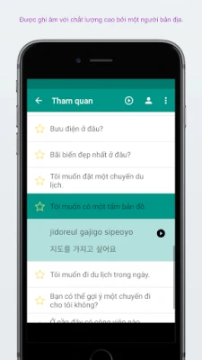 Tất cả các cụm từ và từ vựng tiếng Hàn đều được thể hiện bằng cả phiên âm và văn bản gốc. Chúng đều được ghi âm bởi cô gái bản địa xinh đẹp đến từ Hàn Quốc