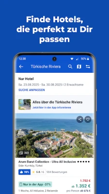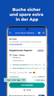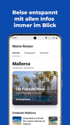 Verwalte, ändere oder storniere Deine Buchung für Pauschalreisen, Hotel oder Mietwagen ganz einfach. Freue Dich mit unserem Urlaubs-Countdown auf Deinen nächsten Trip, halte alle wichtigen Reisedokumente und Daten für den Flug stets griffbereit und erhalte aktuelle Reiseinformationen direkt auf Dein Gerät – per Push-Benachrichtigung.