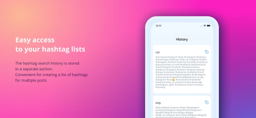 For the explosive promotion of an Instagram account, well-chosen hashtags are needed. We present you with a simple application, it will help you get likes from your posts and get followers from tags into your account. It is enough to copy and paste the desired hashtags. How it works: 1. Enter a keyword 2. The application will select a list of hashtags for it. 3. Just copy the list and paste it into your post. That's all.