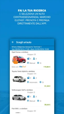E se vuoi noleggiare alla massima velocità, prenota un'auto Elefast: potrai noleggiare l'auto direttamente con l'App in parcheggio, senza bisogno di passare dal banco di noleggio!