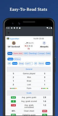 Get easy to read football stats and live scores in same app. Goals, corners, cards, HT, FT, referee stats, you can find all this in the app.