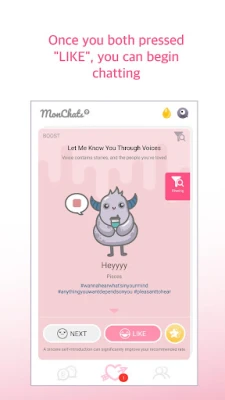 Match. Chat. Date. MonChats is easy and fun—use the "Voice & Like" feature to Like someone. If someone likes you back, It’s a Match! We invented the double opt-in so that two people will only match when there’s a mutual interest. No stress. No rejection. Just tap through the profiles you’re interested in, chat and voice online with your matches, then step away from your phone, meet up in the real world and spark something new.