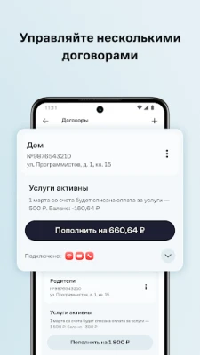 Авторизуйтесь в приложении с помощью номера договора и пароля. Также доступна авторизация по привязанному номеру телефона или email. Если у вас несколько договоров — добавьте все в приложение «Мой Дом.ру» и переключайтесь между ними, не вводя логин и пароль повторно.