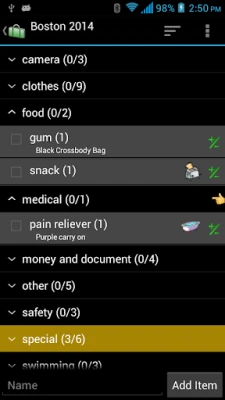 You can group items by category, location, and luggage. Each item also has note, quantity and weight fields. Mass change features allow you to edit lists more easily. You may also email and share your lists. Printing out a copy of the lists helps you in case of lost luggage.