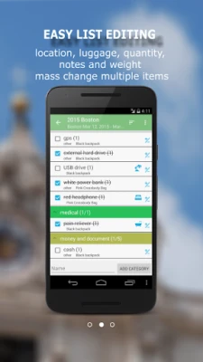 You can group items by category, location and luggage. Each items also has note, quantity and weight fields. Mass change features allow you to edit lists more easily. You may also email and share your lists. Printing out a copy of the lists helps you in case of lost luggage.