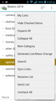 Packing List helps you create and maintain packing lists. It not only lets user to create a list from scratch, but also allows you to generate lists from an existing one. This application comes with several pre-loaded packing master lists. You can simply open the master list(or any existing list). Click on “Generate List/Mass Change” menu item. Check the items you want for your trip and you will have a new packing list ready in no time.