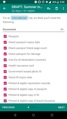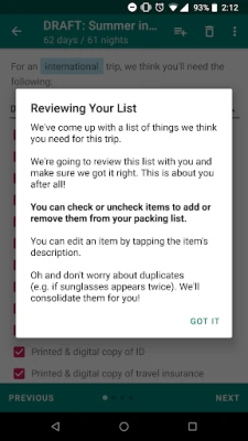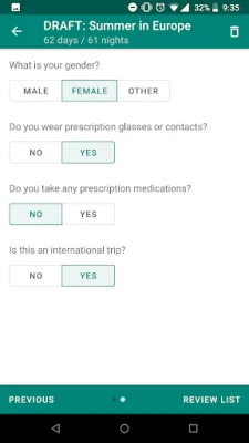 How? We'll ask you questions about your trip and based on your answers, we'll generate a travel checklist for you. And unlike other apps, we'll let you review the packing list we've created one section at a time and give you the opportunity to make changes.