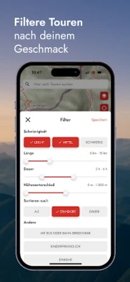 Soll es heute eine gemütliche Tour sein oder suchst du eine Herausforderung? Suchst du eine kinderfreundliche Wanderung? Alles kein Problem: Filtere Touren mühelos nach deinen Wünschen, wie beispielsweise Länge und Schwierigkeit.