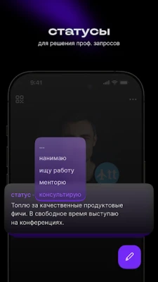 Укажите в профиле один из 12 статусов, которые ускорят поиск работы, сотрудника, эксперта, партнёра, ментора или клиента и помогут добиваться целей. Пользователи сразу будут понимать, к каким профессиональным перспективам вы открыты.