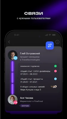 В Сетке есть «сетки», которые пересекают весь рынок по компаниям, профессиям и индустриям. Находите в сетках коллег, экспертов и близких по духу людей. Изучайте ваши общие связи — они помогут расширить нетворкинг и увидеть, например, что до нужного вам специалиста всего пара рукопожатий. Встречайте единомышленников для совместных проектов, прокачивайте карьеру и профессиональный нетворкинг.