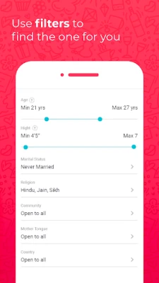 With an intuitive approach, our matchmaking app guides you smoothly through a signup process and will have you interacting with like-minded matches. By using our app, you can create a matrimony profile for yourself, your friends or family members.