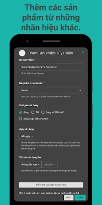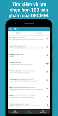 Bạn có thể thêm các sản phẩm chăm sóc da tùy chỉnh từ các nhãn hiệu khác bằng cách chọn ô menu góc trên bên phải phần Quy Trình hoặc chọn tab Tùy Chỉnh trong phần Sản Phẩm.