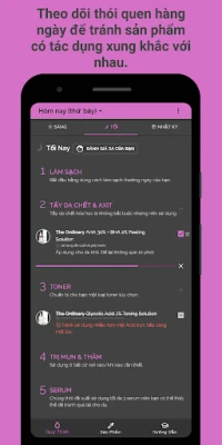 Mỗi buổi sáng và tối, đánh dấu vào các sản phẩm đã dùng trong danh sách để theo dõi sản phẩm bạn đã dùng. Việc này sẽ giúp ứng dụng đề phòng các xung khắc bằng cách hiện những sản phẩm cần tránh.