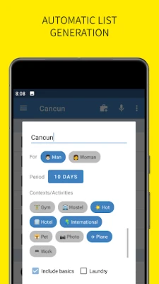 ✈ The app automatically suggests what to bring with you based on travel duration, gender and contexts/activities (ie. cold or warm weather, plane, driving, business, pet etc)