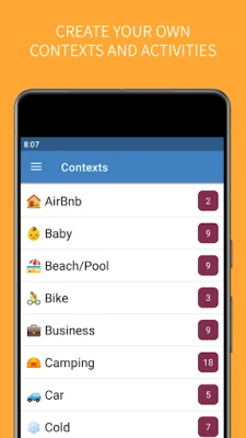 ➕ Contexts can be combined so that items are only suggested in certain situations (ie. "child car seat" is suggested when contexts "driving" + "baby" are selected, "rent a car" for "plane" + "driving" and so on)