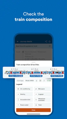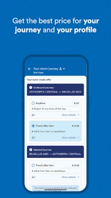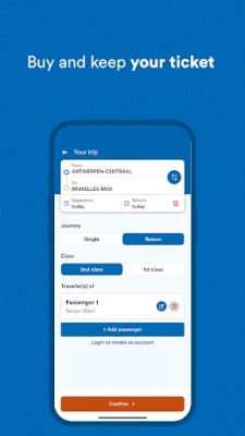 • Buy your train tickets, Multi, Flex Season Tickets, Brupass and De Lijn tickets in the app.