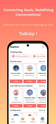Talk UP is your ultimate chat app for secure and personalized communication. Chat with friends, follow them, and tag them with custom hashtags—all while enjoying end-to-end encryption for private and safe conversations.