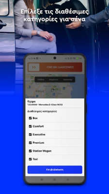 ● Επιλέγεις σε ποια διαθέσιμη κατηγορία οχήματος μπορείς να εργαστείς μέσα σε δευτερόλεπτα. Εάν το όχημα σου εμπίπτει σε πολλές κατηγορίες και θέλεις να επιλέξεις ή να αφαιρέσεις ορισμένες κατηγορίες, μπορείς να το κάνεις ανοίγοντας την εφαρμογή οδηγού, επιλέγοντας το εικονίδιο του οχήματος και τσεκάροντας ποιες κατηγορίες θα διατηρήσεις.