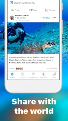 Kết nối với những du khách tâm đầu ý hợp xung quanh bạn, cùng thám hiểm những địa điểm, khám phá và đặt chỗ trước những trải nghiệm, liên kết chuyến đi cùng với các du khách khác và chia sẻ cuộc phiêu lưu của bạn với cộng đồng toàn cầu những người du lịch