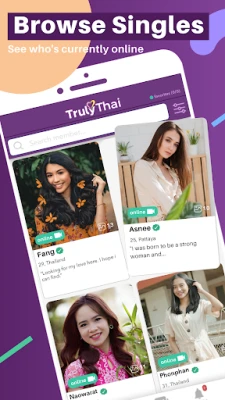 The best Thai dating app. TrulyThai continually connects people throughout the world with Thai singles from Bangkok, Chiang Mai, Phuket, Pattaya, and many other cities in Thailand whenever and wherever. With a large and curated user-base, whether you’re looking for serious relationships or marriage, you’ll surely find your perfect match here.